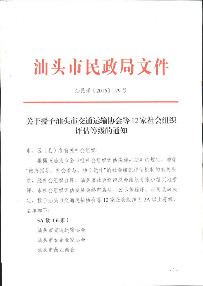 汕民通【2016】179号 关于授予汕头市交通运输协会等12家社会组织评估等级的通知