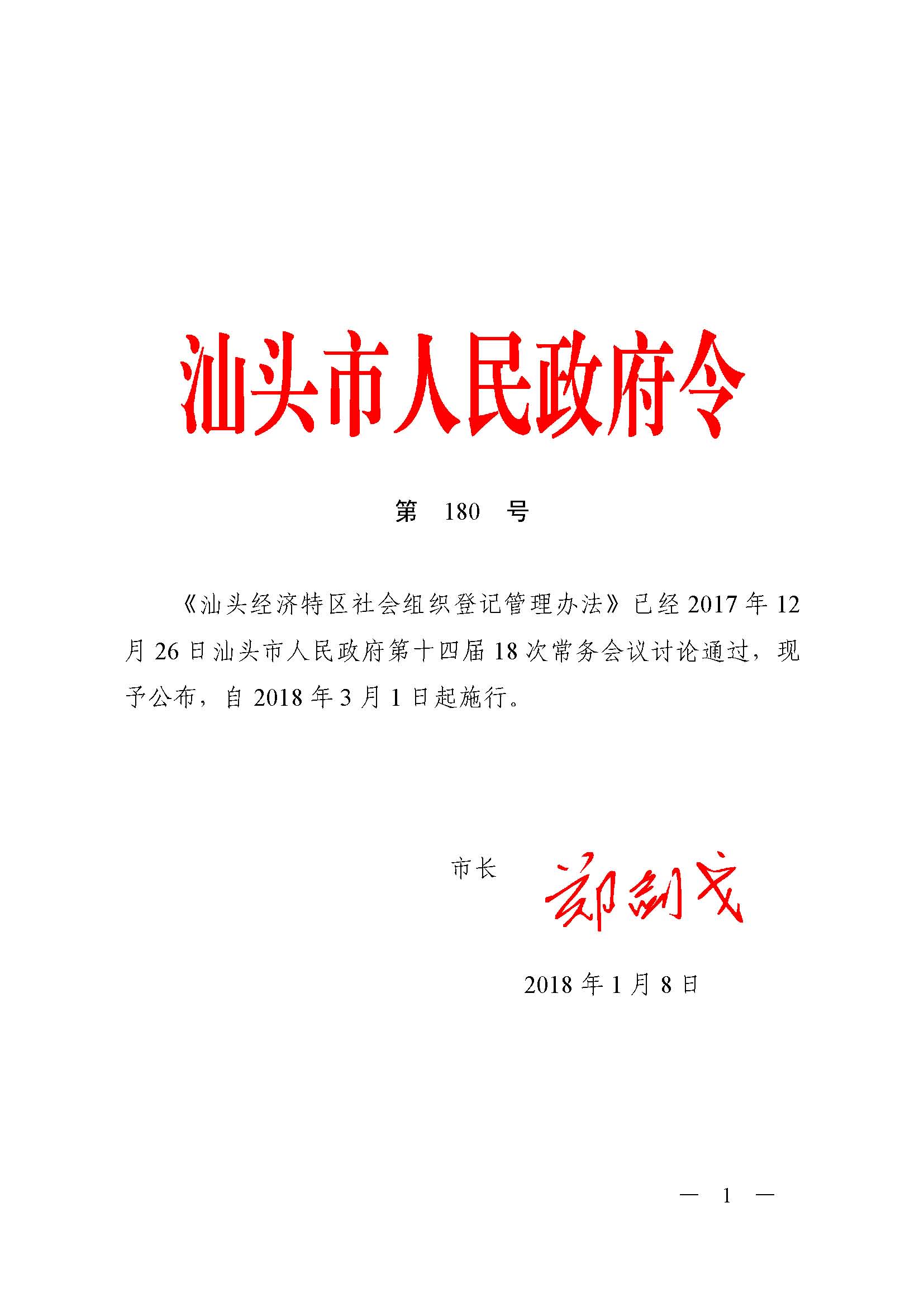 汕头经济特区社会组织登记管理办法(汕头市人民政府令 第180号)