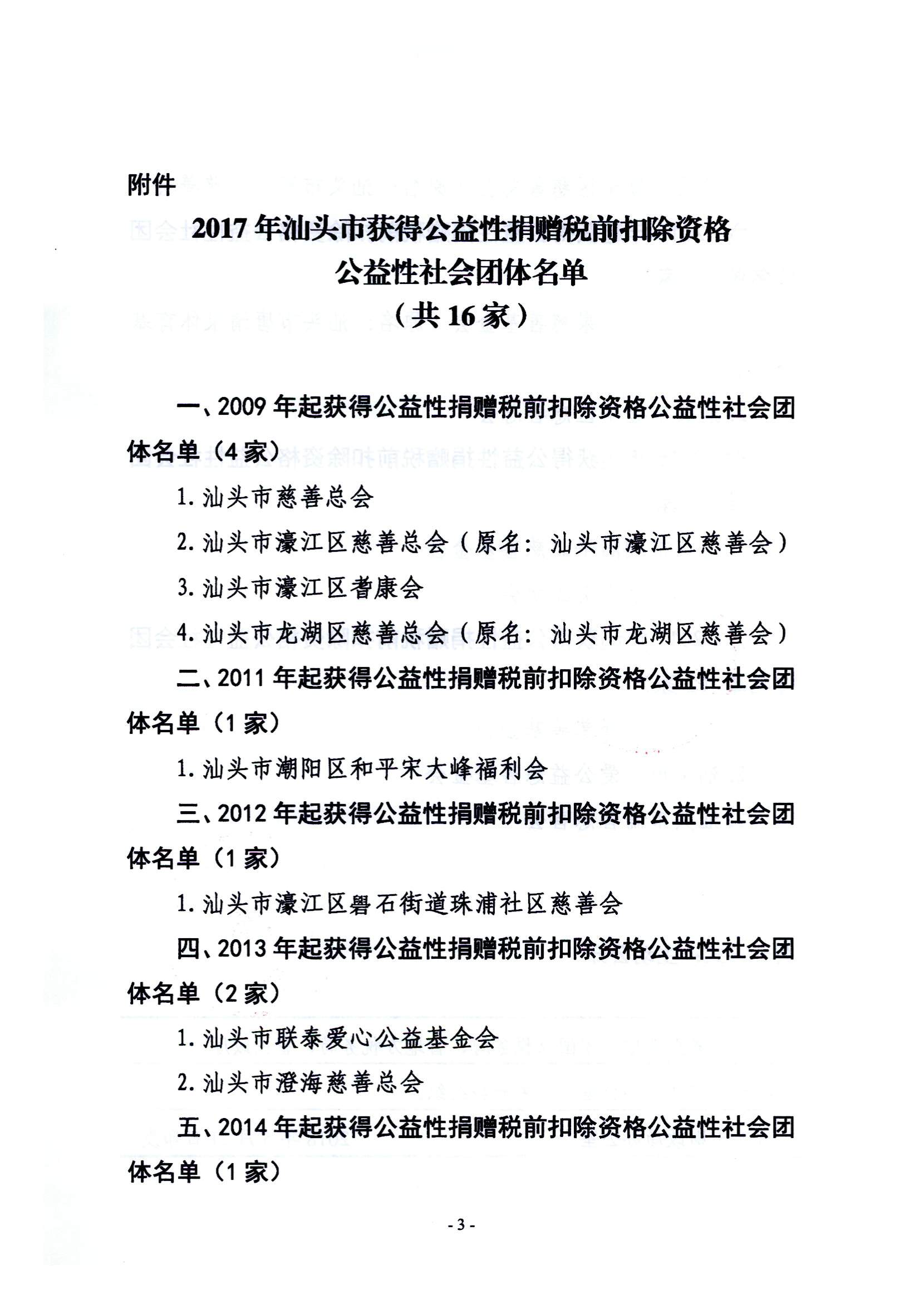 关于公布2017年汕头市获得公益性捐赠税前扣除资格公益性社会团体名单的通知