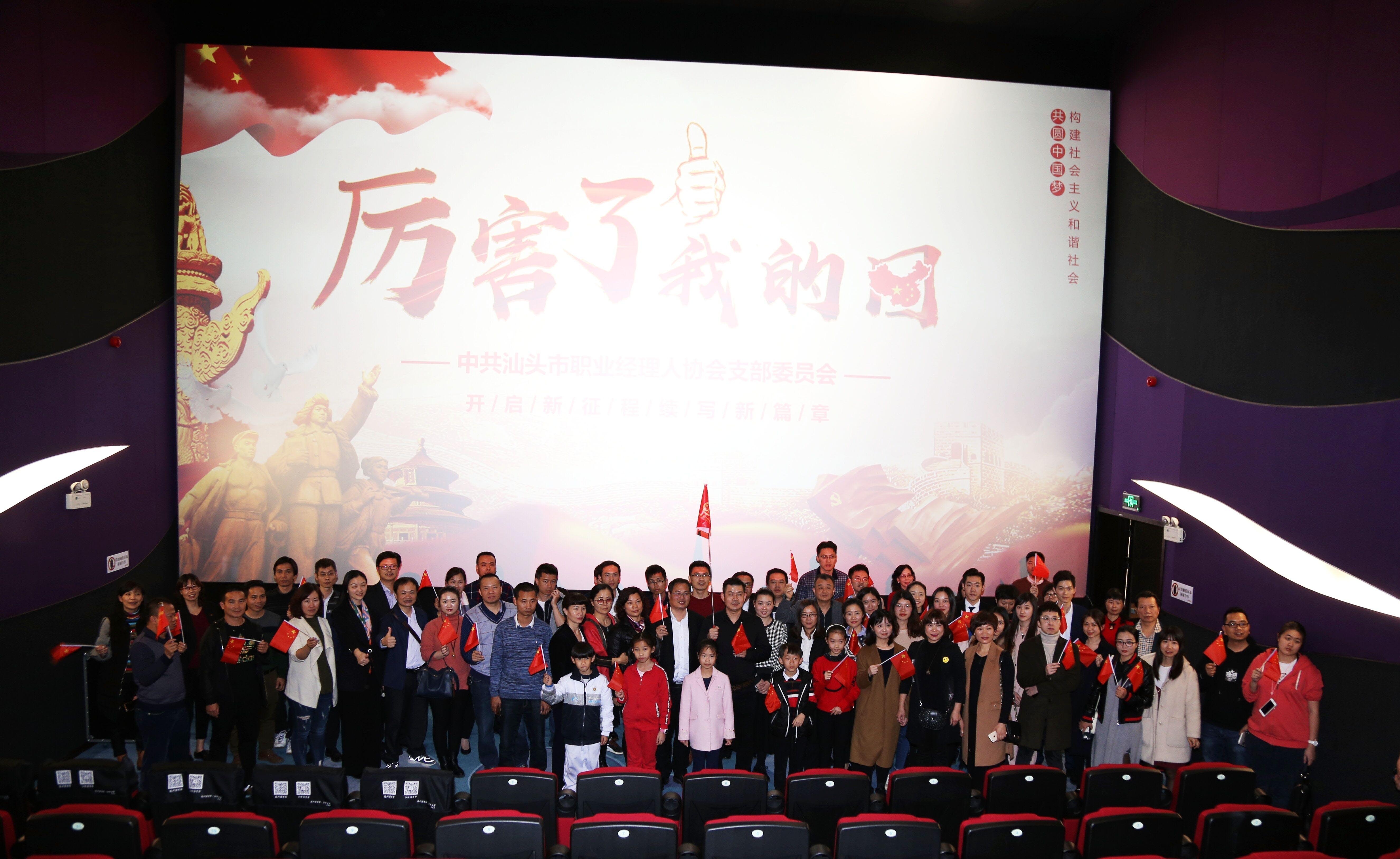 近期,为深入学习贯彻习近平新时代中国特色社会主义思想,深刻领会党的十九大精神,进一步丰富社会组织党组织深入学习贯彻十九大精神的活动内容和形式,中共汕头市职业经理人协会支部委员会、市电影业协会支部委员会等社会组织党组织纷纷举办爱国主义教育影片《厉害了,我的国》集体观影学习活动,营造了浓厚的社会组织学习氛围。