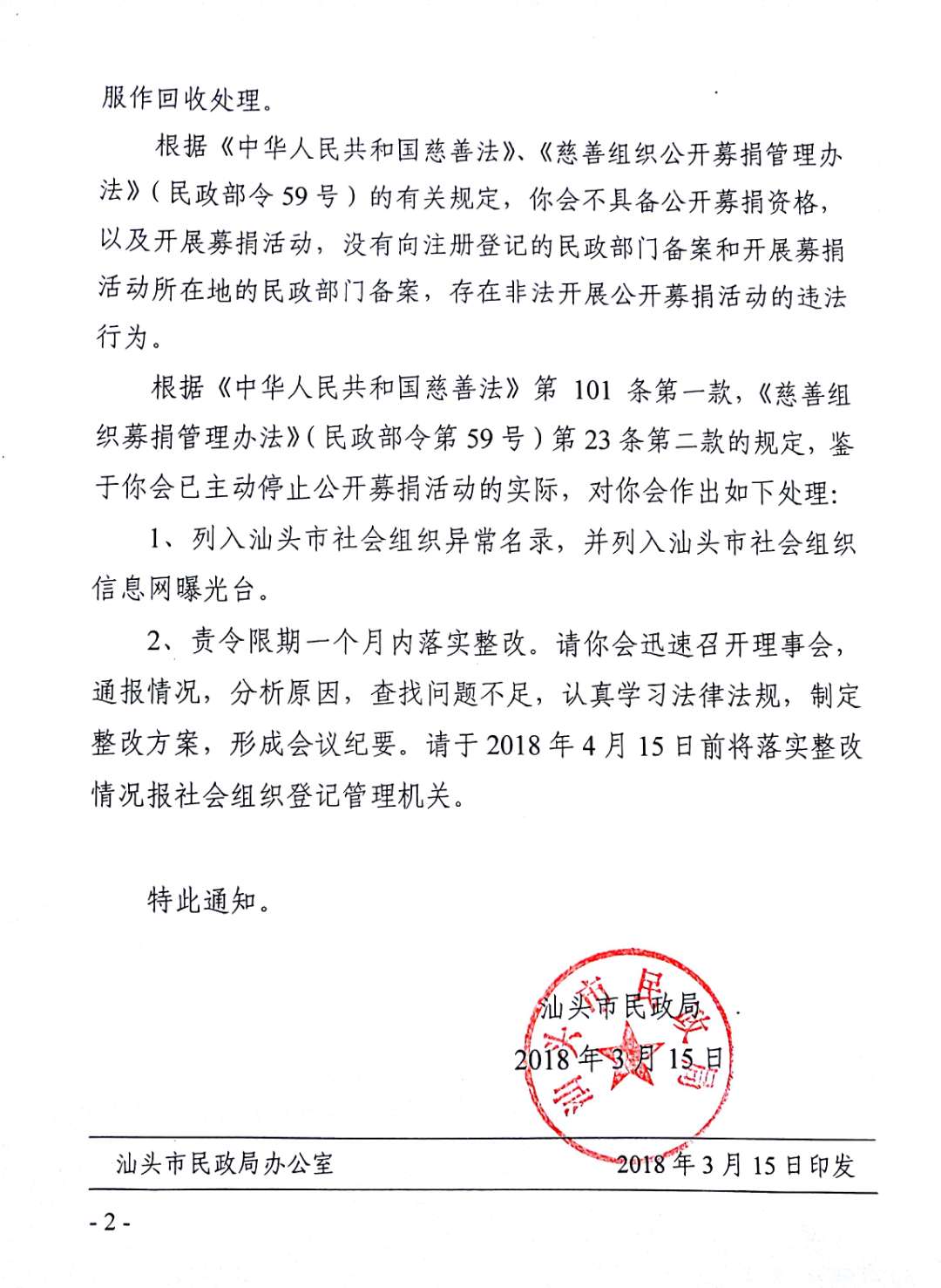 汕头市民政局关于行政执法约谈汕头市明灯慈善会责令限期整改的通知