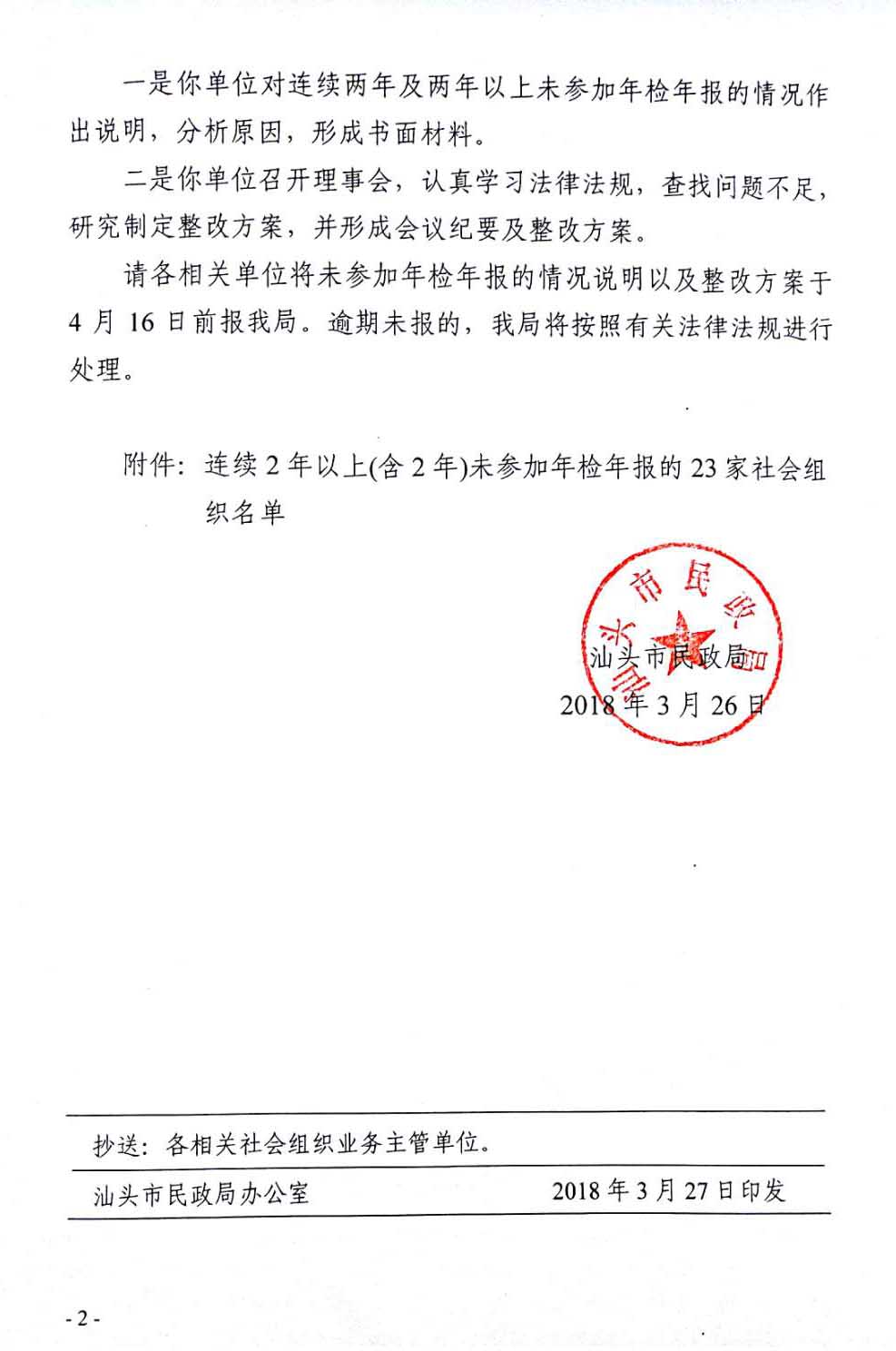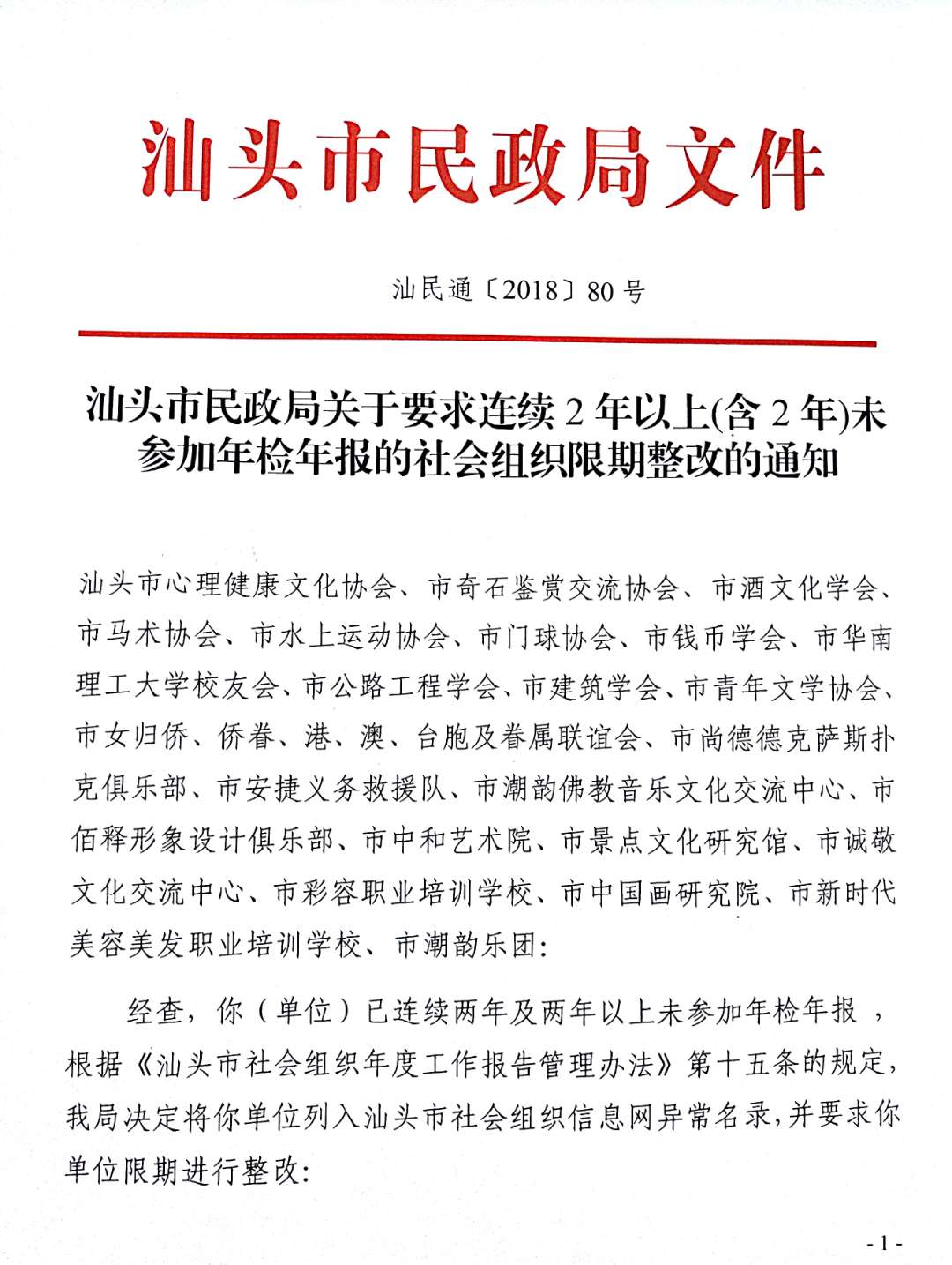 汕头市民政局关于要求连续2年以上(含2年)未参加年检年报的社会组织限期整改的通知
